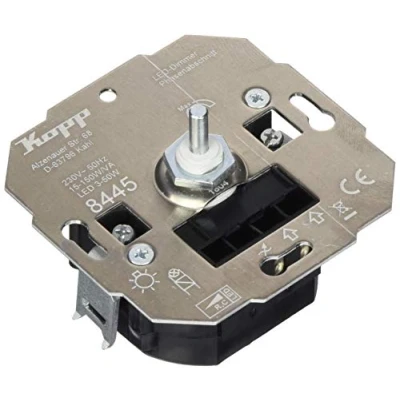 Pressure change dimmer for dimmable LED lamps in the performance range of at least 3 - max. 50 W and for incandescent and 230 V halogen lamps as well as for low-voltage halogen lamps with electronic transformer (phase control "RC") from min. 15 - max. 150 W/VA Only for electronic transformers, not suitable for conventional transformers - details of the transformer manufacturer must be observed. Socket can be used with all frames and covers of Kopp switches Rivo, Malta, Paris, Athenis and Milano Cover frame and central plate with dimmer knob are sold separately - not included Adjustable basic brightness, with soft contrast, shaft 4 mm. Infinitely adjustable allows for individual dimming – the last set brightness level is saved, Manufacturer: Kopp