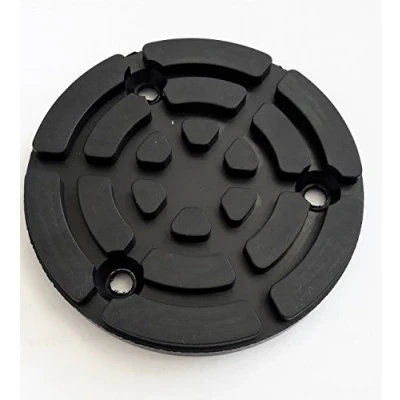 Rubber plate with integrated steel plate for lifting platform Zippo Diameter: 120 mm Height: 15 mm. Weight: 270 g / piece. Drill holes arranged in triangle: edge length triangle distance 75 mm. No need to be fixed over the holes. Suitable for various jacks and lifting platforms.