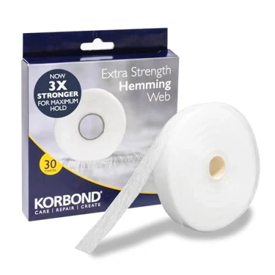 STRONGEST HEMMING WEB: 72 GSM Strength which is significantly higher than any other Hemming Web available LARGE PACK: Pack contains 30m of 2cm width hem tape NO SEWING: Fast and easy to use, Korbond hem web is the quickest solution to create and repair hems MULTI USE: Korbond highest GSM Hem Tape can be used for curtains, trousers and many other applications DRIES CLEAR: Suitable for light and dark coloured fabric