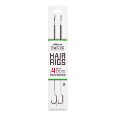 Korda Basix Hair Rigs Wide Gape - Available in several variants - Ready to use wide gape rigs - Number of pieces per package: 2 - Hook sizes: 4, 6 and 8 - Max pull: 18lb/8,2kg and 25lb/11,3kg - Version: equipped with barb - Material: Coated hooklink - Great ready-made rigs - Can be used straight from the pack - Tied with camo green Basix Coated Hooklink - Small piece of hook stripped - More freedom of movement - Greater chance of good hooking - Equipped with flexible hair - Equipped with Hair and Extenda Stops - The end of the line is equipped with a loop - Equipped with Basix Anti Tangle Sleeve - Easy to attach to Basix Lead Clip Leader or Basix Lead Clip Action Pack setup - Hook size 8 is designed for 12mm bait, size 6 for 15mm and size 4 for 18mm - Just add a bottom bait or wafter and you’re ready to fish! The Korda Basix Hair Rigs are available in several variants. These are ready-to-use rigs that can be used right out of the package. Just add a bottom bait or wafter and you are ready to fish! The rigs are tied with the camo green coloured Basix Coated Hooklink leader material. There is a small piece of leader stripped at the Basix Wide Gape hook, this allows for more freedom of movement and a greater chance of good hooking. The hooklink has a supple hair that is fitted with a piece of silicone, which keeps it in place and reduces the risk of tangling. The length of the hair is optimized for hook bait sizes that match the chosen hook size. The hook size 8 is designed for 12mm baits, size 6 for 15mm and the size 4 for 18mm. Each leader is equipped with different Hair Stops and different sizes of Extenda Stops. These allow you to adjust the length of the hair to accommodate other sizes of bait. At the end of the leader a loop is made and a Basix Anti Tangle Sleeve is attached. This allows you to easily attach it to a Basix Lead Clip Leader or Basix Lead Clip Action Pack setup. With these ready to go rigs you are sure to catch fish!