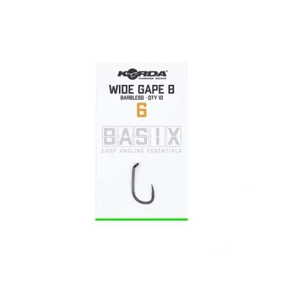 Korda Basix Wide Gape Barbless - Available in several variants - Very sharp Wide Gape barbless hook - Number of pieces per pack: 10 - Hook sizes: 4, 6 and 8 - A perfect all round hook - Unhooked - Aggressive eye bent inwards - Hook will turn and grip quickly - Uses the famous “X” wire thickness - Suitable for water with obstacles - Widely deployable - Very fish friendly - Designed to last - Ideal for use when fishing with bottom baits, pop-ups or wafters! The Korda Basix Wide Gape Barbless is available in several variants. The Basix Wide Gape barbless hook has been designed to be a perfect all-round hook that can be used straight from the pack. It is versatile and is ideal for use when fishing with bottom baits, pop-ups or wafters. Thanks to its aggressive, inward-curving eye, the hook will turn quickly and grip the jaw without the use of kickers or shrink tubing. By using the well-known “X” wire gauge, the hook is suitable for fishing in the roughest conditions. The BASIX Wide Gape is finished with a discreet nickel finish and hook point that is designed to last. This makes it possible to catch more fish on the same hook before it needs replacing. However, it is important to check that the hook is still sharp before casting and to replace it when it is no longer sharp. The model is based on the incredibly effective original Wide Gape, a classic model used by many top anglers today. This hook has many big fish to its name!