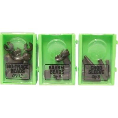 Korda Leadcore Chod Safety System - Complete chod leader system - 8x Chod conical sleeves - 8x Tubular Sleeves - 12x No-Trace Safety Beads - A must for all Chod and Helicopter systems - Use a Korda Ring Swivel size 11 - Unique patented design - Extremely fish safe in case of line breakage - All components are sinking - Ideal to use in combination with Kable Leadcore The Leadcore Chod Safety System is the only system where the top bead can fall freely off the leader/line. This allows the rig to slide unhindered over the leader, so the fish can be drilled in complete safety. Also, if the line breaks, the fish is released from the lead, leader and line with ease! How to use: 1. slide the lower barrel-shaped sleeve onto the Kable Leadcore Leader, followed by the conical shaped sleeve with the wide end pointing towards the main line 2. Slide the Ring Swivel size 11 with the ring onto the leader, or use a Korda Ready Tied Chod rig. After this you can attach the No Trace Bead to the conical shaped sleeve. 3. Attach a Heli Sleeve in combination with Kwik Link (not included) to the end of the leader. Attach the desired type of lead and the system is ready for use The system works optimally as follows: Place the Sleeve and the No Trace Bead at about 30-35cm from the lead. Place the bottom barrel-shaped sleeve about 7.5cm from the lead to keep the rig free of the lead and able to rotate freely on the leader. For best results we recommend fishing with a weak sinking main line. We recommend Subline 15lb or Kontour 12lb.