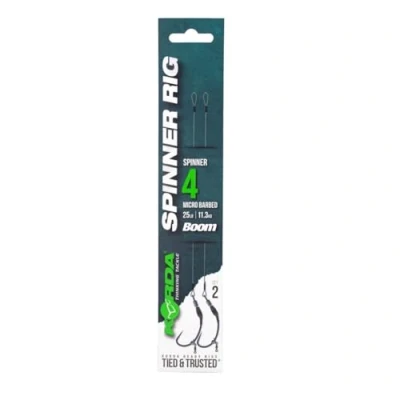 Korda Spinner Rig Spinner - Available in different hook sizes - Packed per 2 pieces - Length: 14cm - Break Strength: 25lb - Equipped with the new Spinner hook - Spinner swivel is pre-shrunk for a secure connection - A 55-degree placed eye - Optimal hooking possibilities - According to the standards of professional anglers! The Spinner Rig, known to many anglers for its appearance in videos, is now available as a ready-made solution for those who don’t have the time or confidence to tie it themselves. The Spinner Hook version, designed specifically for this rig, offers optimal hooking possibilities thanks to its 55-degree-placed eye and curved shank. Constructed to the standards of professional anglers, these ready-tied rigs include a 5.5" Boom hooklink connected via a sturdy Spinner Swivel. Easy to use and reuse!