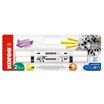KORES - Kreative Marker Acrylic Duo Tip Set 2 colours - Black and White - Brush and Cone Tips for Paper, Wood, Glass, Canvas, Rock, Fabric, Ceramics - DIY Crafts, No Shaking - 2 Pieces DUAL-TIP: KORES Kreative Acrylic Markers feature 2 tips: a cone tip for fine details & a brush tip for flexible strokes. Create with the palette of 12 assorted colours that adapt to every project. MULTI-SURFACE: Use on paper, wood, glass, fabric, canvas, plastic, ceramics and more. Our water-based acrylic markers give even coverage on almost any surface. No limits! SMOOTH FLOW & VIBRANT COLOURS: The advanced filter system gives a continuous ink flow without leaks. Enjoy intensive and strong colours for flawless results on every stroke. No interruptions! EASY TO USE, NO SHAKING: Ready to use with no shake or pump needed, the markers offer an intuitive experience. Their rounded body provides a comfortable grip, making it easy for both adults and kids.