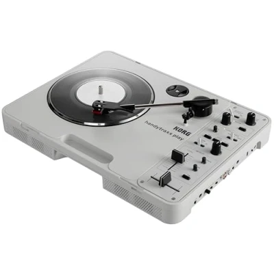 The Korg Handytraxx Play is a portable player that lets you enjoy playing records and performing as a DJ, wherever you go The Handytraxx Play combines portability with cutting-edge features, including unique Korg digital effects including a built-in audio looper The Handytraxx Play has been meticulously designed to provide an exceptional scratching experience. The high-quality fader offers super smooth, precise motion and minimised silent zones for effortless cuts and transitions Variable speed control switch provides intuitive options for adjusting playback speed - effortlessly switch between 33 and 45 RPM or fine-tune the variable speed ratio to match your creative needs Features a custom-designed tonearm, a belt-driven motor with digital rotation correction and a built-in 2.5W speaker that delivers impressive sound with rich bass and clear playback