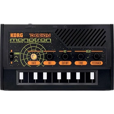 The battery powered, palm sized Korg Monotron Delay is an analogue ribbon synth optimised for classic synth sound effects The Korg Monotron Delay produces a classic analog synth sound through a dual-waveform Low Frequency Oscillator using the same acclaimed analog filter VCF circuit as Korg's classic MS-10 and MS-20 semi modular synthesizers Alongside the oscillator controls there are indispensable Space Delay controls ideal for swooping, cosmic sounds The Monotron Delay's ribbon controller keyboard features a wide, four-octave range. This design allows the pitch to be controlled even more aggressively and dynamically. A miniature speaker is built into the monotron Delay plus there is also a headphone output that you can use when practicing in private, creating sounds at home, recording, or for connecting to an amplifier or PA system