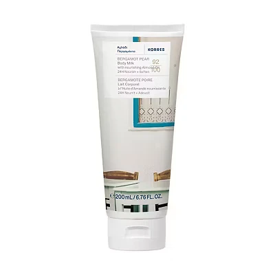 Korres Bergamot Pear Body Milk 200ml delivers 24-hour hydration and nourishment with Greek Almond Oil, Aloe, and Provitamin B5. Featuring a sweet fruity pear scent, its 92% natural origin formula smooths and softens skin, providing lasting comfort and a silky touch for all skin types.