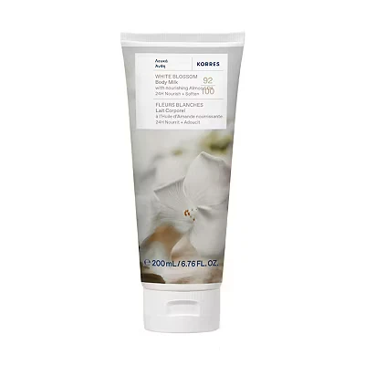 Korres White Blossom Body Milk 200ml is a silky, fast-absorbing moisturizer enriched with Greek Almond Oil, Aloe, and Provitamin B5 to nourish and soften skin for 24 hours. With a delicate white blossom scent and 92% natural-origin ingredients, it's gentle and safe for all skin types.