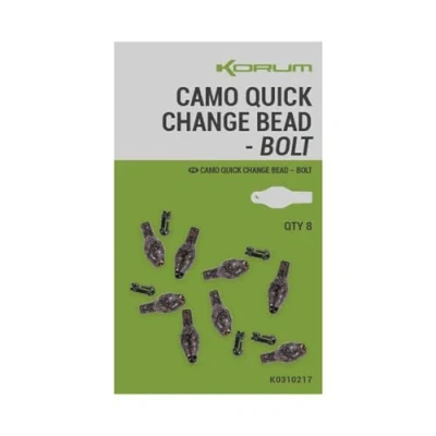 Korum Camo Quick Change Bead Bolt - Iconic Quick Change Bead - Number of pieces per package: 8 - Secure semi-fixed attachment - Quick change of hooklink - Specially designed Bolt bead - Fits all in-line feeders - Provides the perfect presentation - The bead features a unique camo color This version of the iconic Quick Change Bead is designed to provide a secure semi-fixed attachment. It still offers the same benefits of being able to quickly change leaders while fishing. The Bolt bead is specially designed to fit all in-line styles of feeders and provides the perfect neat presentation. The bead features a unique Camo color and matches well with both your feeder and the bottom you are fishing on.