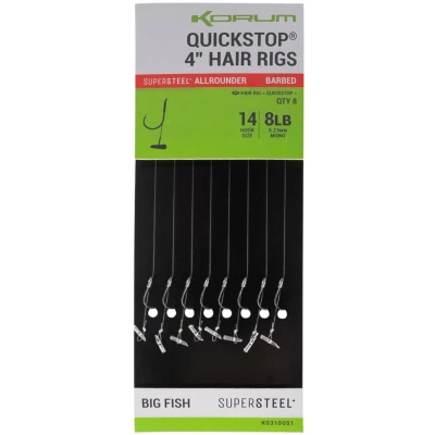 Korum Quickstop Barbed Hair Rigs - Number of pieces in packaging: 8 - Korum Quickstops Clear - Korum Supersteel Allrounder hook - With barb - Very strong hair rigs - Abrasion resistant line - Strong loops - Quick to change - Suitable for larger fish Designed to provide very strong hair rigs suitable for fishing larger fish. The larger line diameters and stronger Japanese hooks offer you the perfect Quickstop Hair Rigs. The material used is highly resistant to abrasion and the strong loops allow for quick change of the leaders. Important! These hooks are barbed.