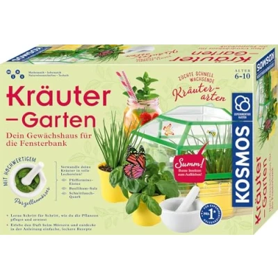 Here, children not only watch plants grow, but prepare great treats from their own herbs - the high-quality porcelain mortar makes it possible With the colourful insect stickers, the greenhouse can be individually decorated, making it a real eye-catcher when lemon basil, chives and peppermint start to sprout The age-appropriate instructions explain to children aged 6 and up step by step what to do: from growing fast-growing herbs, care to harvesting From the windowsill to the kitchen: thanks to the recipe suggestions for mint iced tea, basil salt and chive curd, the little gardeners can easily prepare their herbs themselves A KOSMOS experiment box that conveys knowledge of biology and creates a responsible awareness of nature and the environment Game of the Month award awarded by the Amazon Toys Team, Manufacturer: Franckh-Kosmos