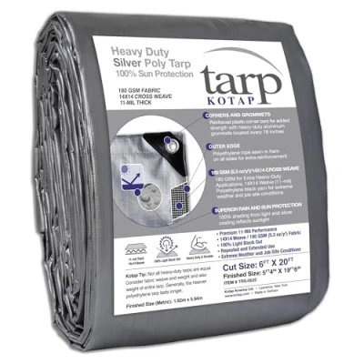 FINISHED SIZE: 5-Feet 4-Inch by 19-Feet 6-Inch Extra Heavy-Duty Applications: 14 by 14 Weave (10-mil thick) for extreme weather and job site conditions Superior UV Protection: 100-Percent shading from light and silver coating reflects UV rays Strong Grommet Applications: Grommets spaced every 18-Inch and reinforced plastic corner bars. Fabric Weave: 14 by 14 per square-Inch (10 mil thickness), Weight: 4.188712522 Pounds, Manufacturer: Kotap America Ltd.