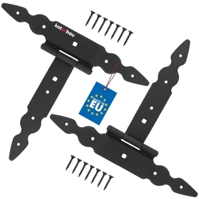 Universal: door hinges for wooden doors are an indispensable component for all wooden constructions. The typical T design makes them ideal for building and repairing gates, gates, gazebos, shutters and other wooden constructions. Durable: The special thing about this door hinge outside is its steel construction, which gives it durability and ensures that it will last for years. This ensures reliable operation of the construction, even during intensive use. Robust: the powder-coated surface of the hinges increases their durability and ensures scratch resistance. This black detail combines perfectly with different types of wood and gives any construction an elegant look. Aesthetic: T hinges foldable in black are functional and aesthetically appealing. They are suitable for a variety of renovation and construction projects. The decorative design makes them a great solution for residential and commercial objects. SPECIFICATIONS | Gate hinge length: 280 mm, total width: 240 mm, length of arm: 200 mm, width of arm: 35 mm, material thickness: 0.3 cm, diameter of holes: 0.4 cm, length of screws: 2.5 cm, diameter of screws: 0.8 cm and 0.4 cm, material: steel, weight: 0.7 kg., Weight: 1.543235834 Pounds, Manufacturer: KOTARBAU