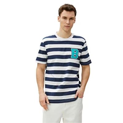 Koton Men's Oversized T Shirt Varsity Embroidered Crew Neck Short Sleeve Cotton, Marine Stripe (06 m), M