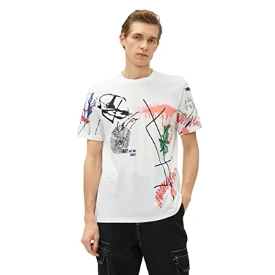 Koton Men's Slogan Printed T Shirt Psyhedelic Detailed Crew Neck Cotton, White Design (0d0), S
