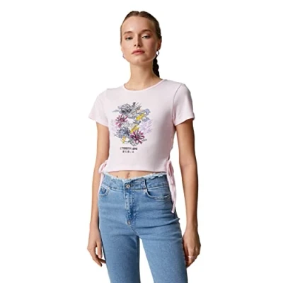 Koton Women's Crew Neck Ribbed Short Sleeve Printed Crop T Shirt, Purple (353), XL