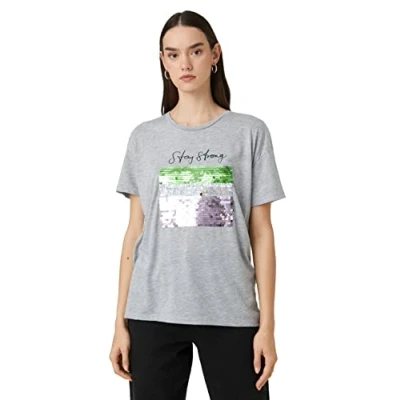 Koton Women's Crew Neck Short Sleeve Sequined Letter Printed T Shirt, Grey (027), XXL