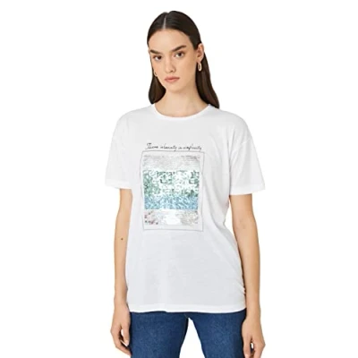 Koton Women's Crew Neck Short Sleeve Sequined Letter Printed T Shirt, Off White (001), Large