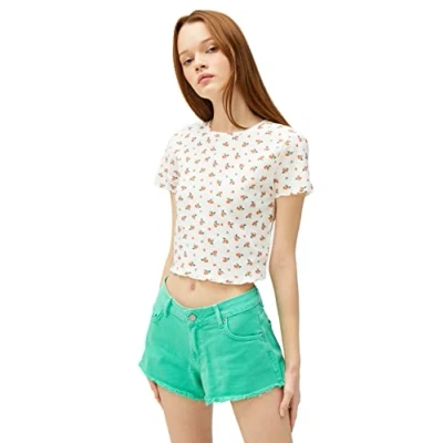 Koton Women's Crop Crew Neck Short Sleeve Cotton Floral T Shirt, Ecru Design (0d1), S