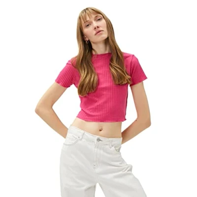 Koton Women's Crop T Shirt Short Sleeve high Neck, Pink (265), Large