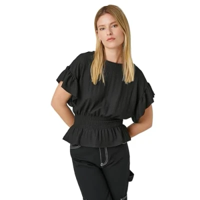 Koton Women's Gimped Voluminous T Shirt Scoop Neck Shirt, Schwarz (999),