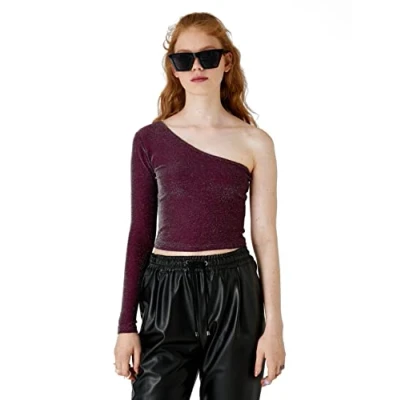 Koton Women's One Shoulder T Shirt Crop Glitter, Bordeaux (467), XL
