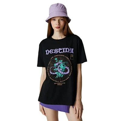 Koton Women's Printed Crew Neck Relax Fit Short Sleeve T Shirt, Black (999), S