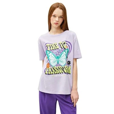 Koton Women's Printed Crew Neck Short Sleeve Cotton T Shirt, Purple (353), XS