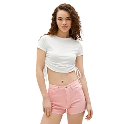 Koton Women's Short Sleeve Crew Neck Shirred Crop T Shirt, Ecru (010), S