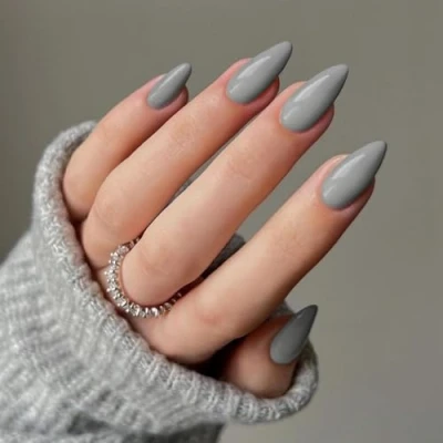 KQueenest Acrylic Press on Nails Almond Medium Length, Grey False Almond, Glossy Solid Color Stiletto Fake Set, Natural Reusable Gel Stick Nail for Women Finger Daily Wear 24 Pcs
