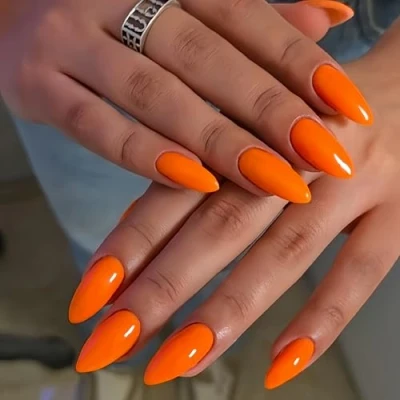 KQueenest Acrylic Press on Nails Almond Medium Length, Orange False Almond, Glossy Solid Color Stiletto Fake Set, Natural Reusable Gel Stick Nail for Women Finger Daily Wear 24 Pcs