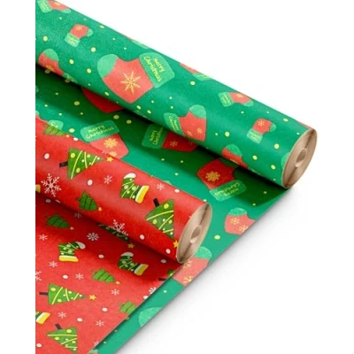 Kraft & Co 2 Pack Christmas Wrapping Paper Roll Festive Designed Recyclable Paper, Perfect for Holiday Gifts, Arts Crafts a Merry (44.5cm x 25m)