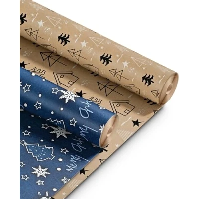 Kraft & Co 2 Pack Christmas Wrapping Paper Roll Festive Designed Recyclable Paper, Perfect for Holiday Gifts, Arts Crafts a Merry (44.5cm x 25m) Jingle