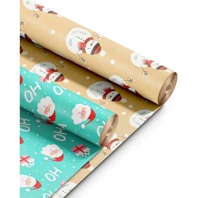 Kraft & Co 2 Pack Christmas Wrapping Paper Roll Festive Designed Recyclable Paper, Perfect for Holiday Gifts, Arts Crafts a Merry (44.5cm x 25m) (Santa New)