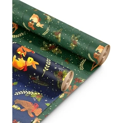 Kraft & Co 2 Pack Christmas Wrapping Paper Roll Festive Designed Recyclable Paper, Perfect for Holiday Gifts, Arts Crafts a Merry (44.5cm x 25m) (CHRISTMAS BUNNY)