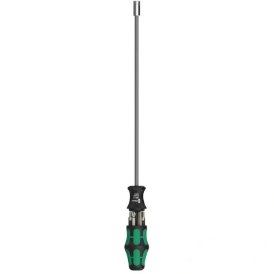 Screwdriver bit holder WERA 27 XL SHK 1 (7 piece) - Particularly suitable for applications in plumbing, heating and air conditioning - 300 mm long rigid blade - Bit holder with very slim design for work in confined spaces - Secure bit holding feature due to locking mechanism. With strong permanent magnet. - Compact stainless steel holder for bits with 1/4"- external hexagon drive as per DIN 3126, ISO 1173 Form C 6.3 and E 6,3 - Magazine with 6 bits integrated in the Kraftform handle - 6 tough bits, for universal use Content - 851/1 Z bits: + 1x PH 2 x 25 mm - 867/1 TORX® bits, TX: + 1x TX 15 x 25 mm / 1x TX 20 x 25 mm / 1x TX 25 x 25 mm - 840/1 Z bits: + 1x 5 x 25 mm / 1x 6 x 25 mm - 1x 1/4" x 300 mm