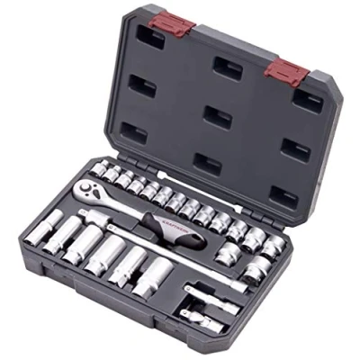 26-piece 3/8 inch socket spanner set With sockets from 6 to 22 mm, adapters and extensions The ratchet head of the 3/8 inch reversible ratchet is significantly slimmer All tools are clearly arranged and within easy reach in a robust case with 2 fasteners., Manufacturer: Kraftwerk