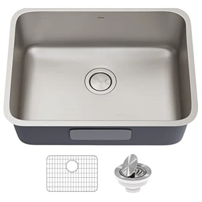 CLEAN HOME PRODUCT: Dex Series sinks feature a naturally non-porous sink surface that’s easy to clean and maintain – CLEAN & CONTEMPORARY sink with clean lines and rounded corners makes modern style possible in any kitchen OUTER SINK DIMENSIONS: 24 3/4 in. L x 18 7/8 in. W x 9 1/4 in. D; INNER DIMENSIONS: 23 in. L x 17 1/8 in. W x 9 in. D; Minimum Cabinet Size: 30 in. – SINK KIT INCLUDES: Large single bowl undermount sink, protective bottom grid with soft rubber bumpers, VersiDrain assembly with removable strainer and FlipCap HEAVY-DUTY CONSTRUCTION with high-performance TRU16 Gauge stainless steel that stands up to your everyday kitchen needs – RADIANT PEARL FINISH: Easy-to-clean and wear-resistant, masks scratches and scuffs that can occur over time – SUPERIOR SOUNDPROOFING: Ultra-quiet NoiseDefend pads with innovative foil layer absorb noise and vibration while sink is in use – Anti-condensation undercoating helps prevent moisture build-up to reduce the risk of water damage in the base cabinet SPACIOUS SINGLE BOWL with rear-set drain offers more usable workspace in the sink, easily accommodates stacks of dishes and large cookware – PERFECT DRAINAGE with rear-set drain opening and gently sloped sink bottom that helps prevent water from pooling – EASY TO CLEAN sweeping rounded corners reduce messy build-up over time UNDERMOUNT INSTALLATION creates a seamless transition from countertop to sink for easy cleaning – INSTALLATION-READY with all mounting hardware and sink cutout template included – PROTECTIVE BOTTOM GRID with soft bumpers helps protect the bottom of your sink from scratches and dents, elevates dishes for better draining – VERSIDRAIN ASSEMBLY with FlipCap conceals waste fittings for a clean look – LIFETIME LIMITED WARRANTY with top-rated customer service available to support your needs, Weight: 14.5 Pounds, Manufacturer: Kraus