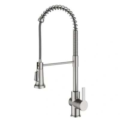 COMMERCIAL FAUCET DESIGN: The Britt Pull Down Kitchen Faucet features a striking silhouette with an exposed-spring design – DIMENSIONS: Kitchen Faucet Height: 22 1/4 in. Spout Height: 6 1/2 in. – Spout Reach 8 3/8 in. – Swivels 360° – Flow Rate 1.8 gpm PULL DOWN FAUCET with Reach Technology offers maximum maneuverability and enables a full range of motion so you can flex, pivot, and reach all around the kitchen sink – Independent docking arm swings to the side to prevent interference with the spray head 3-FUNCTION KITCHEN FAUCET WITH SPRAYER: Switch between aerated stream and powerful spray, or pause the flow of water with the touch of a non-slip rubber button – EASY-CLEAN NOZZLES: Soft rubber sprayer holes allow you to wipe away mineral build-up SPOT-FREE FINISH helps prevent water spots and fingerprints for a beautiful look with minimal cleaning, is not prone to corrosion, and is easy to keep clean SINGLE HOLE INSTALLATION allows you to install this kitchen faucet with pull down sprayer with most kitchen sinks on the market – INSTALLATION KIT includes pre-attached water lines, quick connect sprayer hose, snap-on counterweight, and mounting hardware, Weight: 5.57 pounds, Manufacturer: Kraus