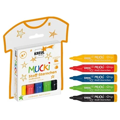Kreul 27156 Mucki fabric stars, 5 colouring pens for children in yellow, red, blue, green and black, line width 2 mm, magical artwork on light textiles