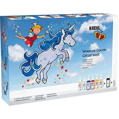 Extensive window colour glitter world window paint set For decorative design of smooth surfaces such as glass, mirrors, tiles and film Paints are water-based and can be mixed with each other Window Paint in Glitter Gold, Glitter Diamond Blue, Glitter Orchid, Dark Red, Golden Yellow and Peach Pink Contour colour in black; glitter shaker, 2 films (approx. 35 x 20 cm), templates and instructions (English language not guaranteed), Manufacturer: KREUL