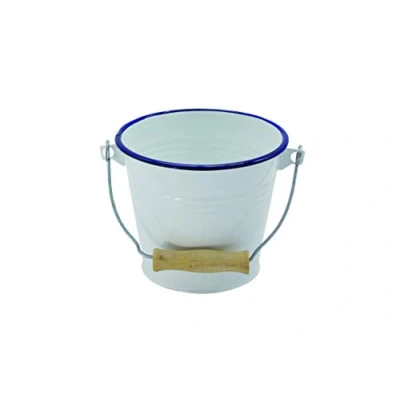Mini bucket from the Husum series made of steel enamel Colour: white on the outside and inside with blue edge; wooden roller on the carry handle Size: diameter approx. 14 cm, depth 13.2 cm, capacity 1.3 litres Versatile, e.g. as table waste, cutlery and plant buckets, but also for decorative purposes Cut and scratch-resistant, easy and easy to clean