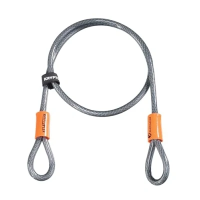 For accessory and quick release component lock-up 4 foot (120 cm) length 10 mm diameter braided steel cable Double-looped cable for use with all Kryptonite U-locks, disc locks, and padlocks Braided steel cable has greater core density than twisted cable, increasing cut resistance Hook and Loop style strap included for carrying ease Durable and vinyl coated Weatherproof