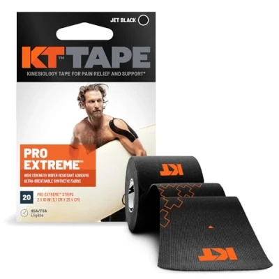 ⏱️ LONGER LASTING - KT TAPE PRO EXTREME is stronger elastic core retains its elasticity far better over time than cotton kinesiology tape. This means it will provide stronger support, for as long as you need it, and then some. Like top athletes, it relies on both strength and endurance to get the job done. ⛓️ SYNTHETIC MICROFIBER - KT TAPE PRO EXTREME Kinesiology tape can be worn comfortably in the shower, in the pool or while riding big waves at microfibers. You triathletes, swimmers, surfers and sailors are sure to appreciate it. Synthetic microfibers are fast drying and provide superior weight-to-strength ratios. These fibers are also naturally anti-microbial, which allows for comfortable extended wear without the funk. 🔗 STRONGER ADHESIVE - KT TAPE PRO EXTREME is engineered to perform in the harshest environments, to last for up to three days, through multiple runs, daily showers, in humidity, cold or in the pool. And just like KT TAPE PRO, Original KT KINESIOLOGY TAPE features a patented Secondskin Adhesive that will go as long as you do, and-no offense-probably longer. ✂️ PRE CUT "I" STRIPS - KT TAPE PRO EXTREME is precut and ready to apply right out of the box. Precut strips have rounded corners which help to prevent the corners from snagging on things or the edges fraying. Each roll contains 20 10-inch "I" strips. That's 16.6 feet of tape, all 2 inches wide, for you mathletes out there. ⚙️ HOW TO APPLY - 1 ✂️ Trim or shave excess hair from the area to be applied. | 2. 🧴 Use rubbing alcohol to remove any lotions or oils on the skin. Allow the skin to completely dry. | 3. Do not allow there to be any stretch on the last two inches on either end.