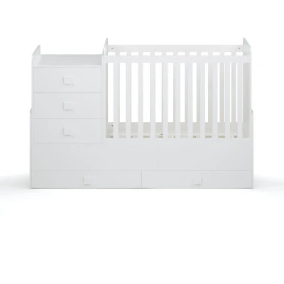 General description The Kudl 1200 Combi 4 in 1 Children's Cot Bed is a versatile and space-saving solution for your child's needs. This product features a cot with three height settings, a changing unit, and a toddler bed, making it suitable from infancy through toddlerhood. The design includes three drawers for storage, which can be detached and used separately once the cot is no longer needed. The cot is constructed with safety in mind, featuring high sides and teething bars to protect your child. Technical specifications Dimensions: L173.5 x W65.5 x H109 cm Weight: 84 kg Material: MDF + Wood Color: White Installation Easy self-assembly is required, with clear instructions provided for a straightforward setup. Usage This cot bed serves multiple functions: as a cot for infants, a changing table, and a toddler bed with additional storage drawers, maximizing space in any room.