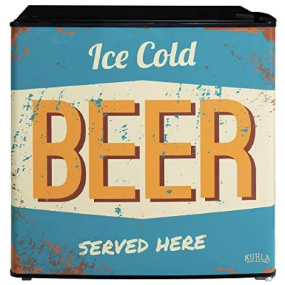 AmazonSTYLISH MINI FRIDGE – Vintage beer design, table top drinks and snacks cooler. Ideal beer fridge. Perfect for your kitchen, bedroom, office, student dorm, den or home bar. 45L STORAGE CAPACITY – Compact yet surprisingly spacious, this small fridge fits up to 42 x 330ml cans. Plenty of space to store your favourite cold refreshments and snacks. ICE BOX & TRAY – Perfect for frozen treats or offering ice cubes to your party guests. VERSATILE STORAGE – The removable shelf lets you adapt to your needs, plus two door racks give extra storage. Perfect for larger items and stacking cans – fill it with wine, beer, soft drinks, or a few standard bottles of fizz. GREAT FOR GIFTING – Ideal gift for birthdays, Christmas and special occasions. DIMENSIONS - (H)50 x (W)48 x (D)45 CMs WEIGHT - 13kg