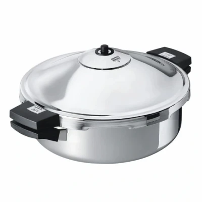 Kuhn RikonThe Duromatic Hotel range offers larger capacities and diameters than the other models in the Duromatic range.The Hotel range has a timeless elegance with black handles and valve housing. The pan is made from high quality 18/10 stainless steel, it has two side handles for easy, balanced lifting. Use this large diameter shallow pressure cooker without the lid as a frying pan, it's perfect for browning and sautéing. Put the lid on and bring up to pressure to quickly cook casseroles, curries, risottos and more. Frying pan pressure cookers are available in a smaller 2.5L size both with and without a titanium non-stick lining.