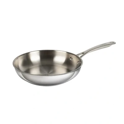 The 18/10 stainless steel used in this frying pan consists of 18% chromium and 10% nickel. This combination contributes to the pan's hardness, rust resistance, and overall durability. The chromium content helps to create a robust surface that withstands the rigours of daily cooking, while the nickel enhances resistance to corrosion and staining. This makes the frying pan a wise investment for long-term use, as it retains its attractive appearance over time compared to lower-quality options like 18/0 stainless steel.