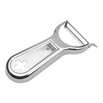 The Swiss Metallic Pirahna Peeler is the sharpest peeler made by Kuhn Rikon. The super-sharp stainless steel piranha blade peels soft-skinned fruits and vegetables with minimal wastage. Made from premium 18/10 stainless steel, the peeler is designed for an ergonomic grip in either hand and also features a potato-eye remover. • Sharp, refined stainless steel blade starts sharper, stays sharper • Ergonomic design works in right or left hand • Convenient potato eye remover • Dishwasher safe • Gift boxed • Made in Switzerland