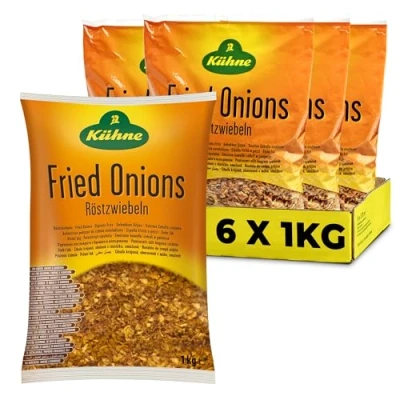 Our crispy fried onions taste excellent with hot dogs and are suitable for seasoning, cocking and garnishing or as a snack on its own In the functional dosing cup – sealed freshly roasted Vegan and Vegetarian friendly 6 x 1kg